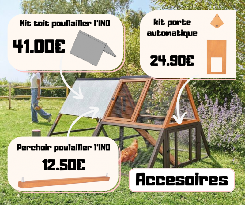 Accessoires pour compléter votre poulailler : En plus de nos poulaillers et extensions, nous proposons une gamme d'accessoires pour optimiser le confort et la fonctionnalité de votre espace avicole. Que vous ayez besoin d'un perchoirsupplémentaire pour vos poules, d'une porte automatique pour faciliter l'accès ou d'un kit de toit de secours pour une protection supplémentaire, nous avons tout ce dont vous avez besoin pour créer un environnementparfait pour vos précieuses poules.