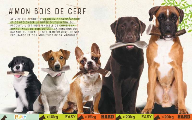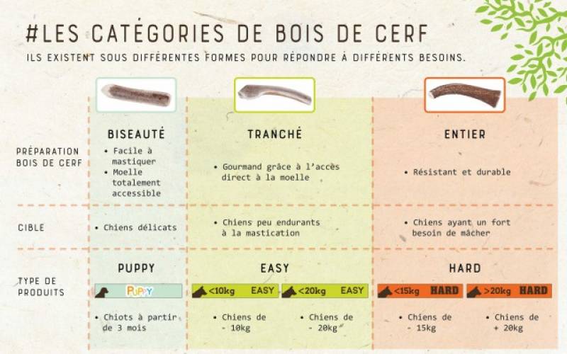 Les bois de cerf sont plein de nutriments tels que le calcium, le phosphore, la glucosamine, la chondroïtine et le zinc. Tous ces minéraux sont connus pour favoriser la croissance et prévenir de l'obésité chez votre chien.